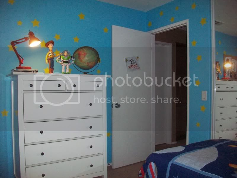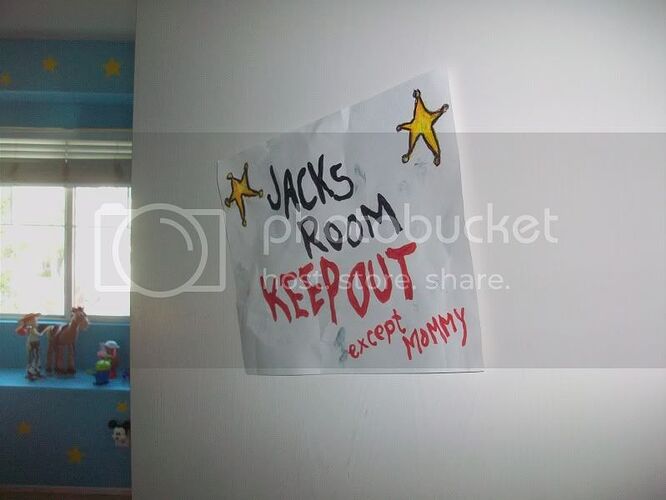 On Jack’s door is a replica of a sign that Andy has posted on HIS door in part one. I found a jpeg of the original sign and using Crayola markers and crayons, I traced over it, replacing Andy’s name with Jack’s and Molly’s name with “Mommy.”