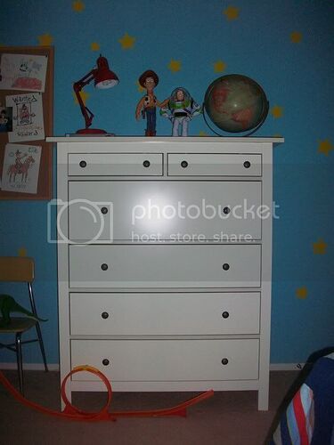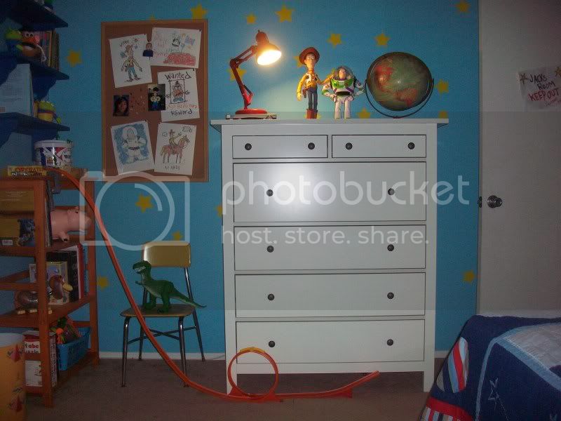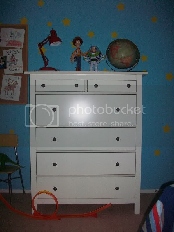 A trip to Ikea netted me the most cost-effective replica of Andy’s chest of drawers. I decided early on that I would settle for furniture that almost but not entirely resembled the stuff Andy had in HIS room, hoping that with a few modifications, I would be satisfied. The pulls on this chest still have to be replaced or at the very least, they have to be painted white.