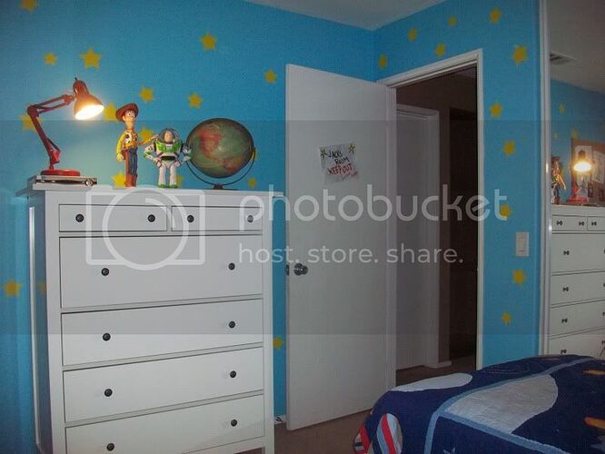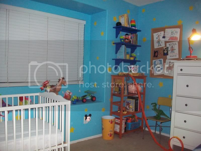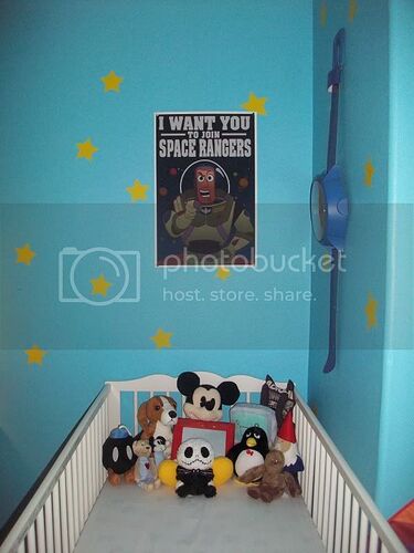 Hello there, everyone. This is my first post at Pixar Planet, but I’ve been lurking here for a while. In February, my wife and I have discovered that we’re going to have our first child! Our boy, Jack Always, is to be born on September 23rd. We almost immediately started brainstorming his nursery. After toying with both an “Adventure Time” themed room and one based on “The Nightmare Before Christmas,” one night at work, I somewhat impulsively started eBaying several toys featured in the “Toy Story” flicks. I already owned Woody and Buzz, but within a few hours I had ordered a Hamm piggy-bank, Rex, and a bucket of Little Green Army Men. When I went home to my wife that morning, it was decided: Jack Always would have a Toy Story room.