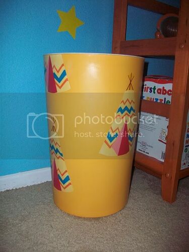 Someone here made a replica of Andy’s teepee-covered trashcan by drawing out a pattern on Photoshop, printing it out and wrapping the print around a can of Lincoln Logs. I used his pattern and printed out the teepees on waterslide decal paper and slid them onto a trashcan I’d painted with Krylon Bauhaus Gold.