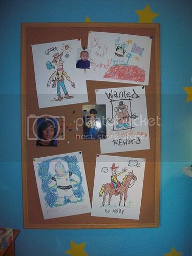 I bought a bulletin board that matches the one Andy uses to display his art. Here at Pixar Planet is where I found Toodles’ fullsize replicas of Andy’s crayon drawings and printed them out. I also put up a couple pics of my now 15 year-old nephew…he was the former owner of this room and a big “Toy Story” fan himself when he was younger.