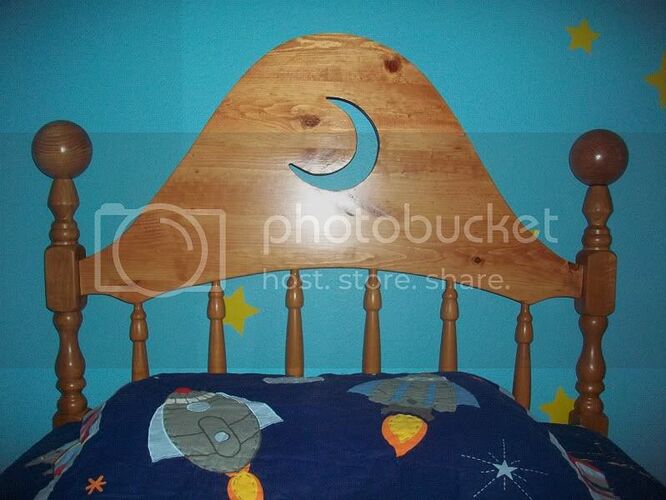 A British company was offering an exact replica of Andy’s very distinctive bed…for WAY MORE than I was willing to spend. I decided to modify a headboard that was a pretty close match. Since I had little experience woodworking, I was a bit scared…but I gooned my way through it. I jigsawed out the middle portion of the headboard and the moon cut-out. Afterwards, I ordered a couple 4" wooden balls and mounted them on the existing posts. A couple layers of stain later and I’m EXTREMELY happy with the end result.