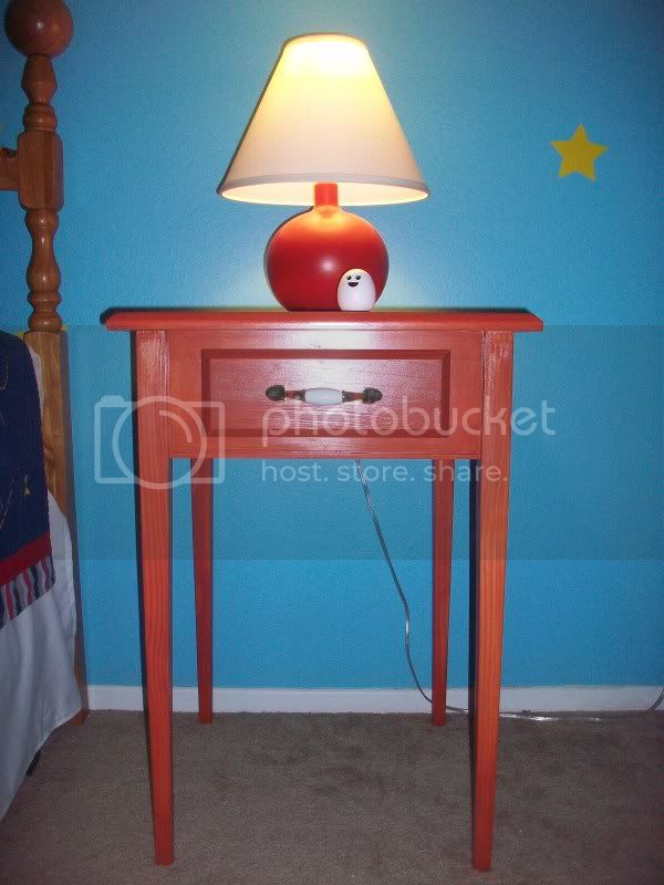Finding a bedside table similar to Andy’s was ALSO a bit difficult. A carpenter on eBay made this one for me. All I did was stain the pine to match the bookcase and replace the hardware with a pull closer to what Andy had.