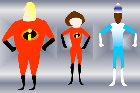 Well, I’ve learned a lot of things from Pixar. One things is that human characters are very difficult to animate, but they are easier in 2D. However, I had to actually build models for each of the human characters. Here are my first PowerPoint models for Mr. Incredible (Bob), Elastigirl (Helen), and Frozone (Lucius). I’m going to need a few opinions. What do you think?
