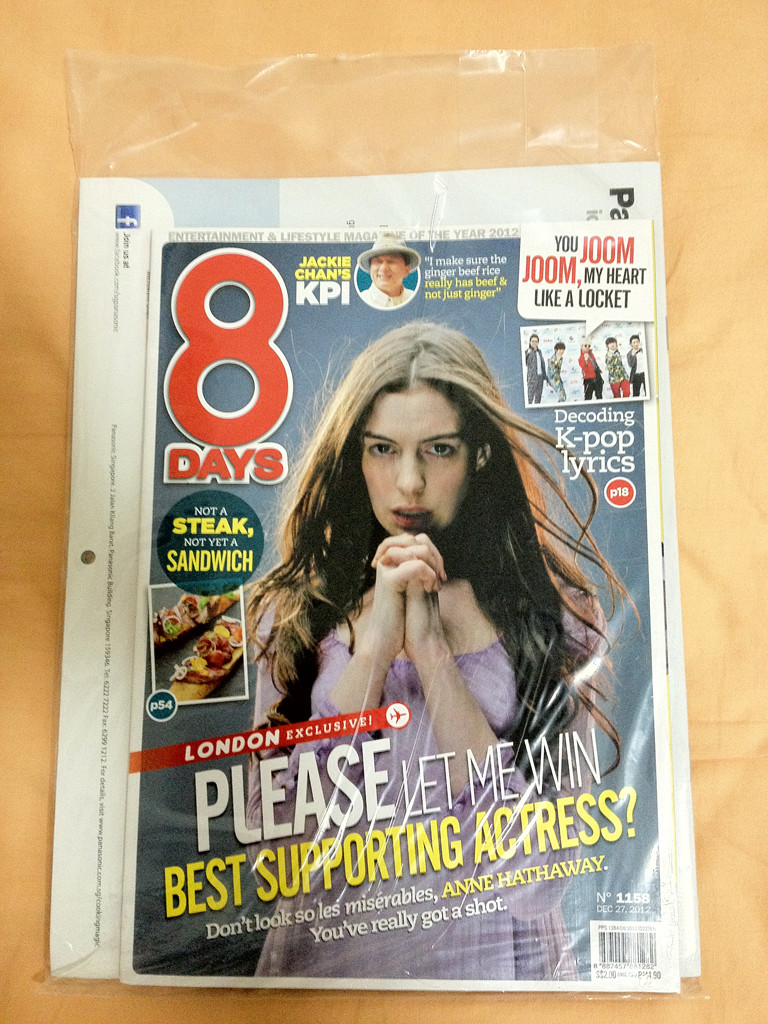This is a recent issue of 8 Days, an entertainment and lifestyle magazine in Singapore that I just had to buy cos’ it has the adorable Anne Hathaway as poor Fantine on the cover. Just look at her pleading eyes!