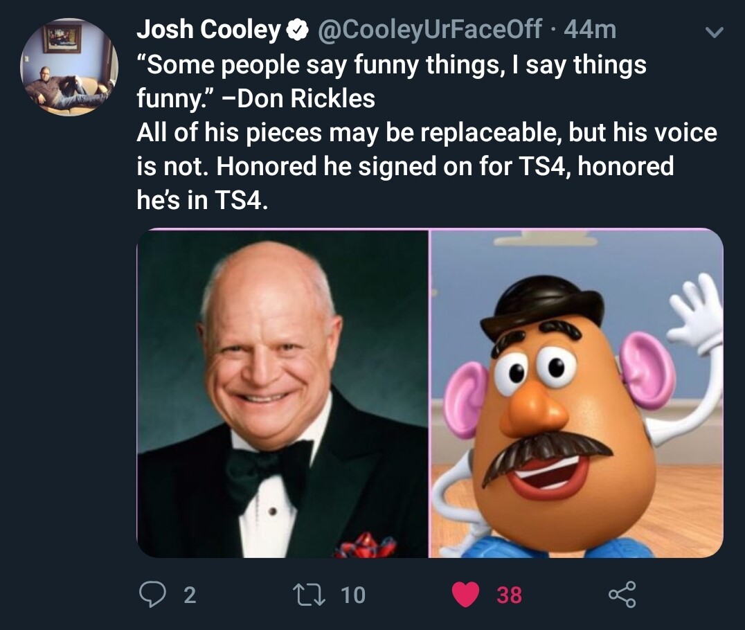 “Of course we loved Don obviously, and after he passed, his family contacted us and asked if there was any way that we could create a performance using the recordings that we had,” Cooley tells EW. “Now, he signed to be in Toy Story 4. Unfortunately we did not get a chance to record him for the film. But we went through, jeez, 25 years of everything we didn’t use for Toy Story 1, 2, 3, the theme parks, the ice capades, the video games — everything that he’s recorded for Mr. Potato Head. And we were able to do that. And so I’m very honored that they asked us to do that, and I’m very honored that he’s in the film. Nobody can replace him.”