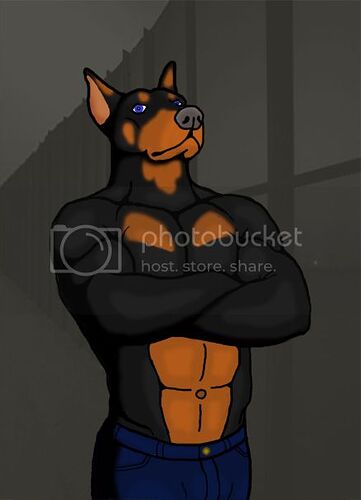 I’m working on some more “animagusurreally” pictures, but in the meantime I’m experimenting with some additional different styles. Here is an anthro doberman pincer guard at a fog-shrouded secret base.