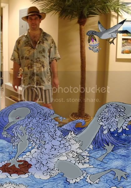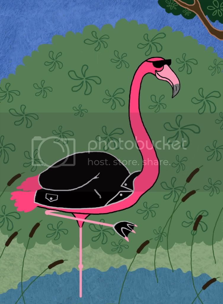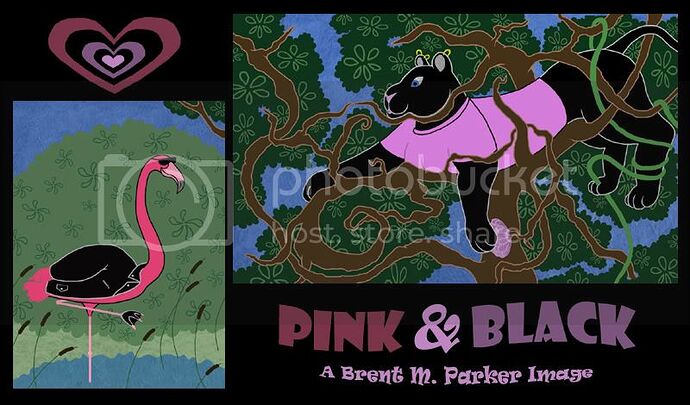 This picture was inspired by seeing someone wearing black pants and a pink blouse. I thought it was a great color combination. I’m planning to add a flamingo in a leather jacket to this picture, but at the moment I don’t have access to my scanner.