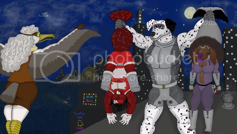 Damian Pound, a.k.a. “Barbell”, a Dalmatian supervillian with super strength, holds up unconscious superheroes Remi Vitoux/“Dammage” the beaver and Iris Deck/“Identity” the bloodhound. The heroes’ albatross teammate, Isabel Cruz/“Pratfall” ponders her next move She’s a stuntwoman with imperviousness-to-injury powers.