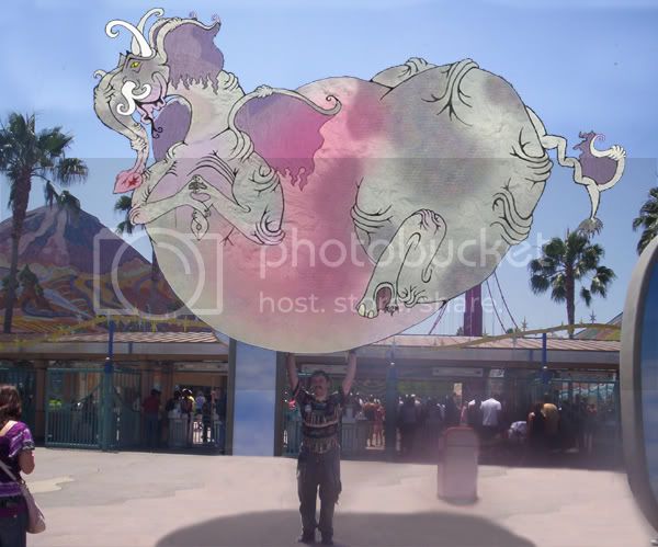 Here I am holding up an entire dracophant in outside the main gate of Disney’s California Adventure, and nobody is even looking! (Perhaps they know that they’re filled with heated gasses, like a hot air balloon.)
