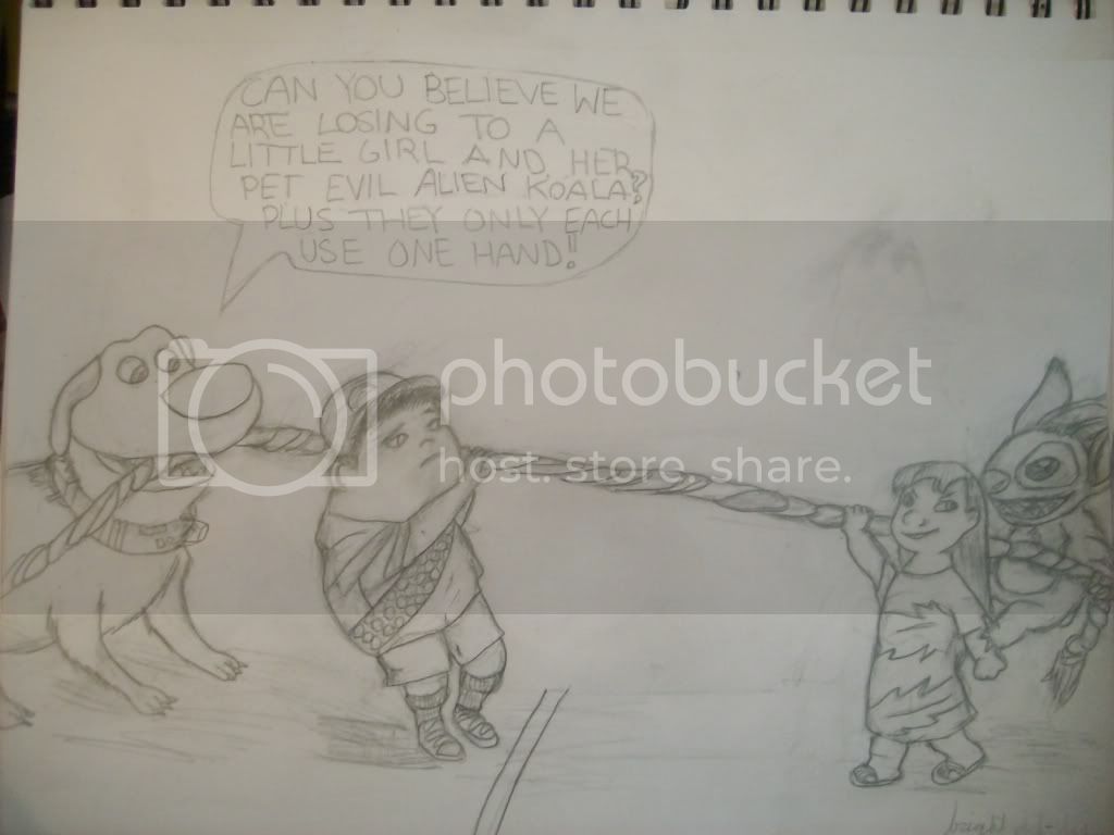 See? Lilo is barely using any effort as Stitch is piggybacking her and tugging easily with one hand because of his super strength. This sketch took hours and a lot of tries to get the characters right but I did it!