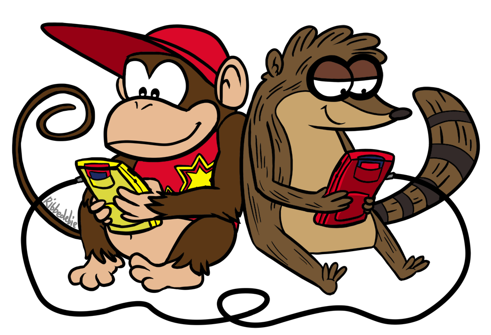 I could make something for on a shirt of my own at the place I’m working as an intern at (they make shirts and stuff and I get to draw everything!) and I really wanted something Donkey Kong Country or Regular Show. Couldn’t make up my mind. Thus, Diddy Kong and Rigby playing Game Boy Color with a link cable.