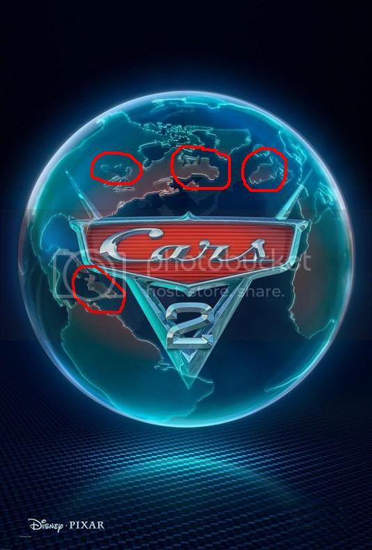 -Lightning, Mater, Finn, and Francesco silhouettes around the globe in the Cars 2 poster.