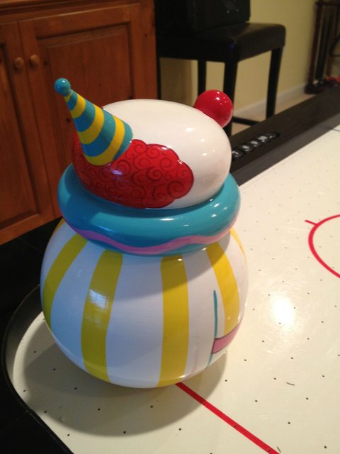 Got my clown this afternoon. Shipped by UPS, but delivered by USPS. Clown looks awesome. I was surprised by the weight. He is heavy. Chime is perfect. Pink stripe perfect. Very few hand painted areas, but you can’t tell. He takes up a lot of space!