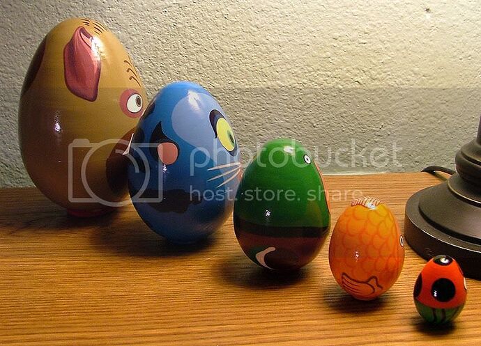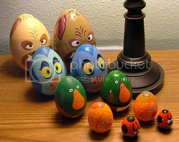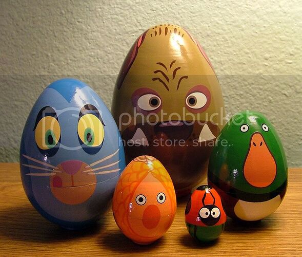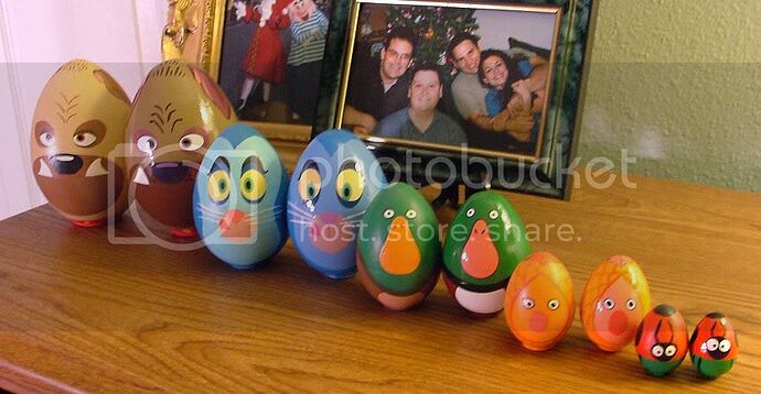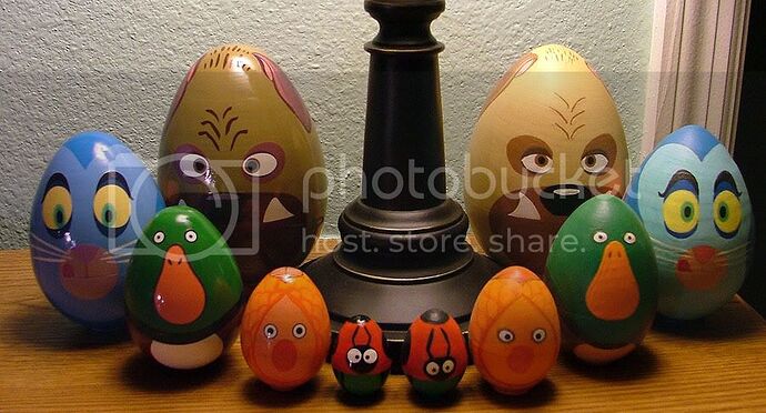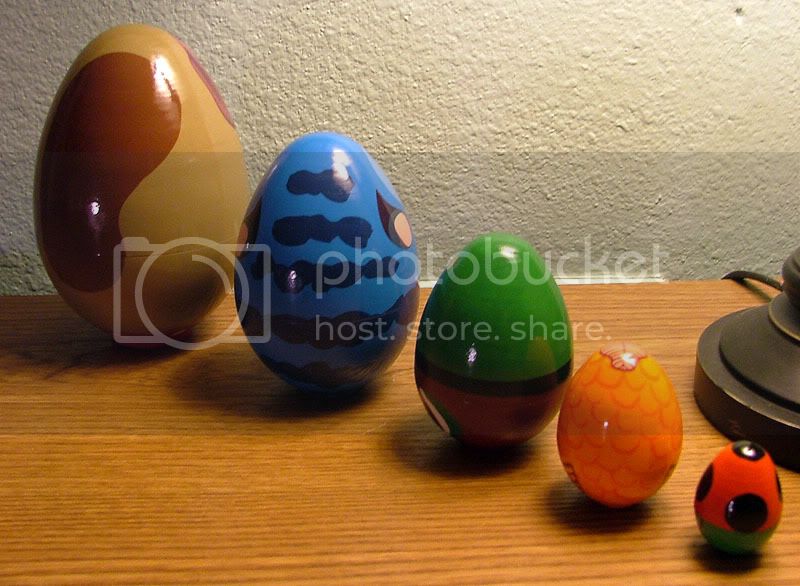 I got home from work late tonight to find a box waiting for me. It was a set of Troikas! The shipping to here was crazy fast, which is great…I know he JUST sent these out, so the post office was ON IT. I know I should wait until the morning to take pics and share them because they will look amazing in natural day lighting, but I was a little too excited to wait…so here are a few pics of the troikas that Slink sent, next to the ones I had painted for myself a while ago. I told him when I ordered them that I wanted a set and wanted to support the project, but that I would most likely still keep the ones I painted on display. One glance inside of the box and that went out the window. These look even better in person. I am really excited for those of you that ordered them to see them. A couple of tiny minor quibbles: The base color of the dog I feel is just a tad too dark, and while the lacqeur on them certainly makes them appear plastic from afar, you can definitely see the wood of the material come through in a few places…look closely at the forehead of the dog in my first pic and you’ll see what I mean. But since they are wooden eggs it was completely unavoidable. The texture of the wood is still going to show, but it doesn’t distract from them at all IMO. They are still magnificent. Can’t wait to hear what the rest of you think of yours. I love them personally. Couldn’t be happier. Great job, Slink.