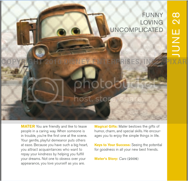 The breakout star of Cars, Mater! Continuing this rather bizarre run of Pixar characters everyone seems to be getting. I’m sure that’ll change up as we go along depending on who replies or not.