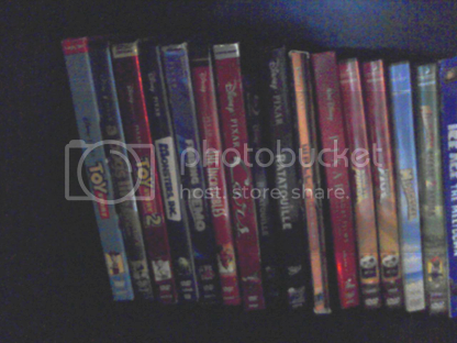 I put them in chronological order with my Short Films DVD at the end. But I’ve become so disorganised lately that they’re either next to my computer scattered around, or in my room. I need to have quick access to them to take screencaps, get audio clips etc. I don’t actually own all of the Pixar DVDs gasp Yes, I’m the worst hardcore Pixar fan ever. There’s 3 that I need to complete my collection, and the others I don’t own, I have copies.