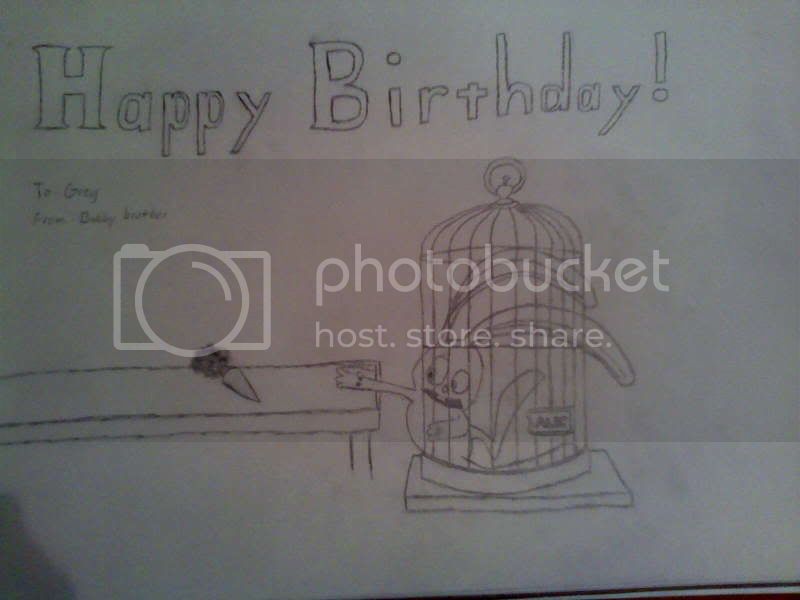 I’m pretty happy with it, took me about an hour-hour and a half to draw, and I added the text and darkened it up afterwards. I hope he likes it! I dunno if I’ll end up getting a scan of this, since he’s keeping it. I took this with my phone (has a better camera than my camcorder! O.o)