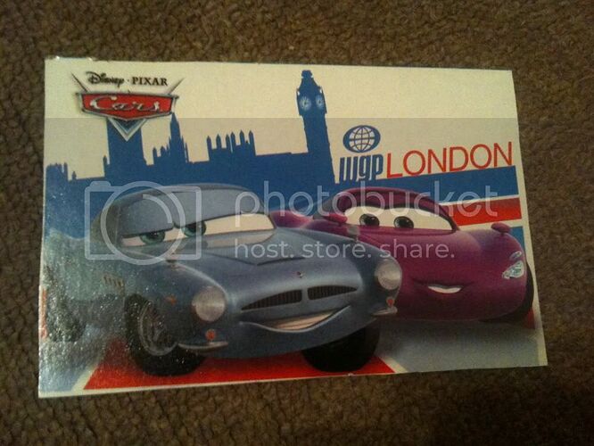 My sister cut out and gave to me a Cars 2 postcard thing from a box of Mac 'N Cheese. It has Finn and Holley on it, and even though it’s just a couple of stock images stuck together, I think its cute. ![]()