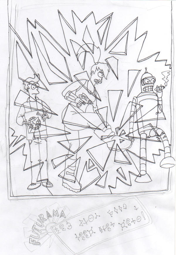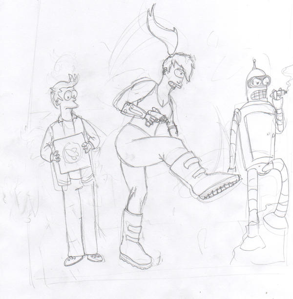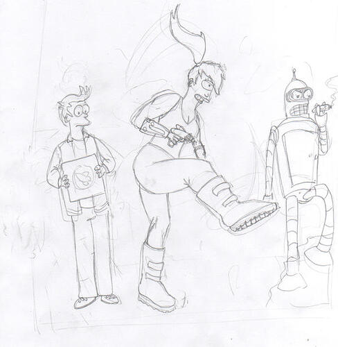 As you can see I’ve only roughly done the characters so far, and there’s no background/foreground. I’m not quite happy with the faces or poses yet, they need work. Anyway I’m going to put a big window in the foreground that Leela is kicking through, Bender is going to be stepping over what’s left of the frame. And there’ll be some sort of New New York background. I’m also going to shade them as if they were real people and not cartoon characters and see how that looks.