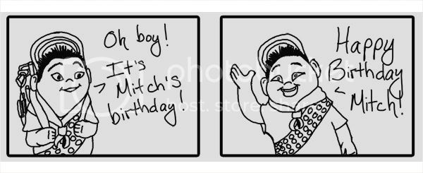 Here’s a birthday present for, Mitch. Not nearly as good as how Mitch draws Russell, but I had to try!