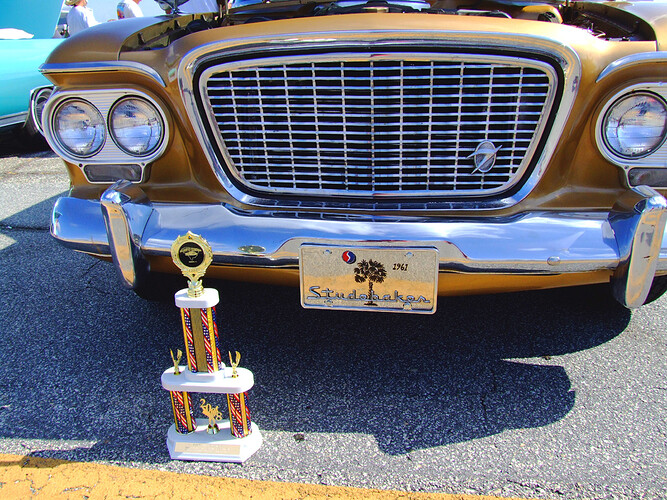 My hobbies are what keeps me sane, though to many people, they’re a bit “out there”. I collect and breed tarantulas and other spiders and arachnids(scorpions, mostly), for one thing, as well as snakes. I love spiders and snakes and going to reptile shows/sales, though due to gasoline prices lately, I haven’t been to one since the fall. I also am really into classic cars, and my biggest hobby at the moment, in terms of the time, money and effort I put into it, is showing a 1961 Studebaker Lark VIII Cruiser, which is basically an original car, not a hot-rod. I call it “Gold Digga”, not only because of the metallic “Tiara Gold” paint(original Studebaker color and paint formula), but because of the money I’ve sunk into it! I actually have two Studebakers, this one and a 1951 Champion four-door sedan that is still in need of restoration and not road-worthy at this time, though it’s no piece of junk by any means. I’m trying to decide on whether to keep that one and finish it up, or sell it and buy a different Stude, since there are many models I really want, including a truck(yeah, they made trucks, too). I got the Cruiser out at its first-ever multi-make, or “open” car show, this past Memorial Day weekend, and it won its class division, “Production Cars: 1959-1964”, which means any American or foreign-made car or truck(not hot-rodded) other than a Ford or Chevrolet, including things like Cadillacs, Pontiacs, AMC, Buicks and Mercuries. The show was sponsored by the Palmetto Cruisers Car Club and held at the Florence Regional Airport in Florence, SC. Here’s a pic of my “baby” with the trophy: