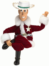 “Disney Toy Story Holiday Hero Woody. Woody dressed up like Santa, says 5 holiday phrases including: There’s a reindeer in my boot!m Put that mistletoe down!, I’m warnin’ ya, Let’s wrestle up some presents!, I’m going lasso me a Merry Christmas!, Jangle Spurs, Jangle Spurs, Jangle all the way”