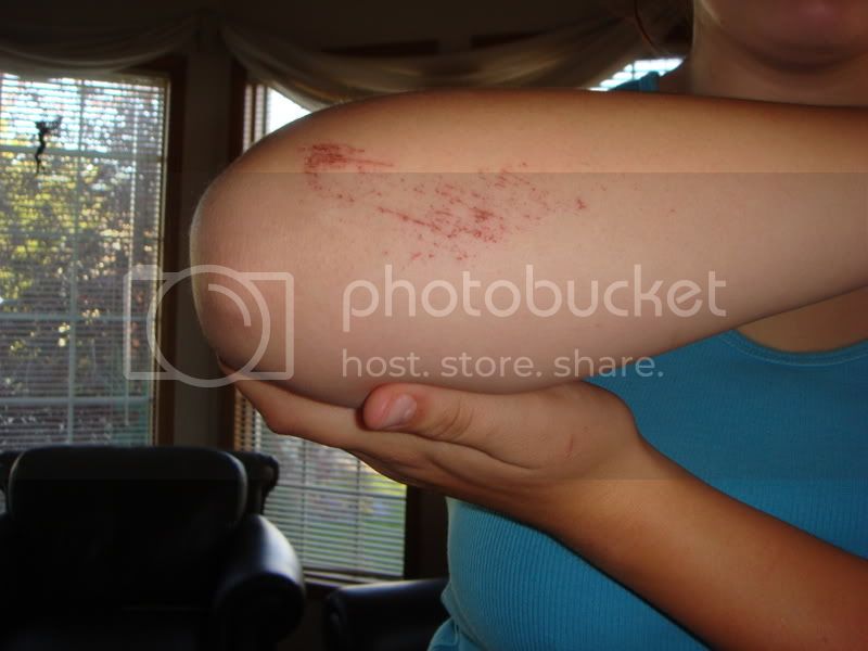So they took me to the hospital and I got x-rays done. No broken bones, thank goodness. My arm is all gouged up and I bruised so many bones. I’m so sore. I can’t walk right now. =[ It sucks.