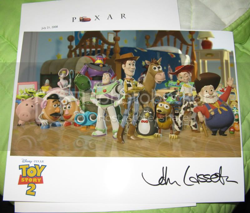I finally remembered to take a picture of the autograph from John Lasseter I got back in July. It is only a preprint, but it is still really cool getting some back!