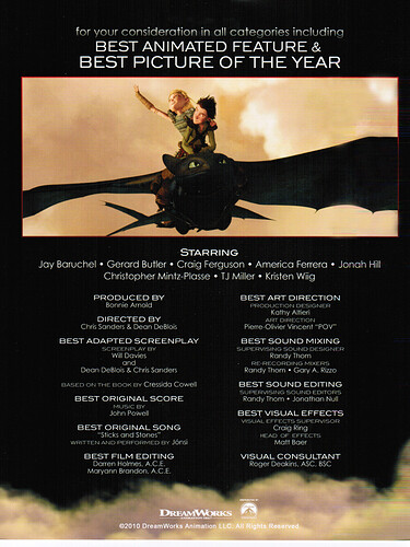 I do have to give credit to Dreamworks for putting in a decent attempt to get HTTYD nominated in a variety of categories, not just the obvious Best Animated Feature. I would have gone with the climatic shot of the Forbidden Friendship scene, but that’s just me, and I honestly hope such trifling matters don’t make a huge differece. It does strike me as odd that they didn’t put it properly forward for best director, though. Is there some sort of rule against two-director teams getting nominated?
