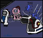 A few balls got past him, breaking the glass of the repair area, and some bounced along the walls. One got him in the back and the leg, making him kneel down. “WALL-E! I COULD USE A LITTLE HELP!”. Wall-e peeked out from his confined space, then noticing the danger, quickly pulled out his arms. Sean swat back the next ball, grabbing Wall-e and dodging to the side, tapping his play button, the Unbirth popping out. Eve had heard Wall-e earlier, how could she not, and let loose with a plasma blast, hitting the tennis-robot possessor. She aimed for the second, but had to dodge when a large handed robot aimed to strike her, the initials HAN-S written on it. It posed to strike again, that is before Vee came up between them, locking hands with the robot’s. He planted his clawed feet as well as he could, growling as he entered a test of pushing strength with it. Eve was at first facinated that despite both of them being the same size, that this blue-lizard-like creature was just as strong as a machine designed for strength.