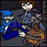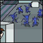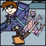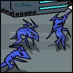 The doors slid open, and as the dark parted, it revealed several blue tinted, red-eyed Unbirth. Some were looking back, but turned when the light changed an the sounds and “wrrs” from the robots alerted them. “Oh…crud…” Sean mouthed. The forcefields holding the robots also fell…and the robots fell victim as well. As the three got to their feet, several Unbirth took the offensive, jumping at the robots and integrating themselves into their malfunctioning circuits.