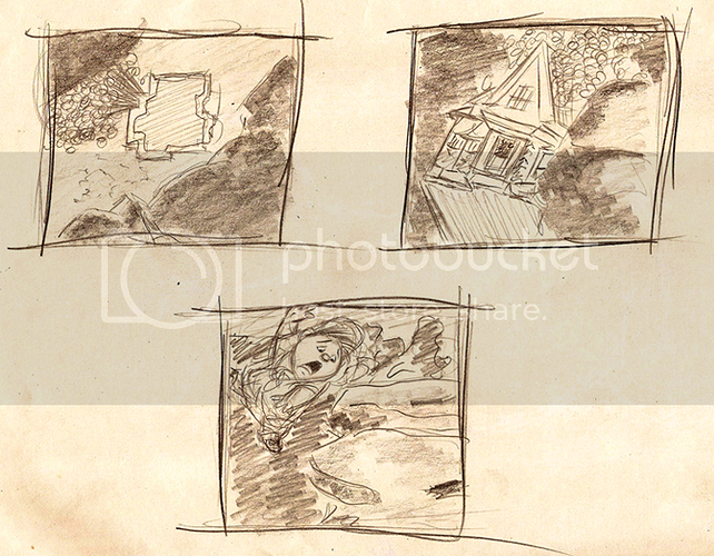 I referred to an action sequence from one of the behind-the-scenes featurettes for Up for the storyboard panel. Yes, I know my version sucks. Even I can’t tell what’s going on. (heh)