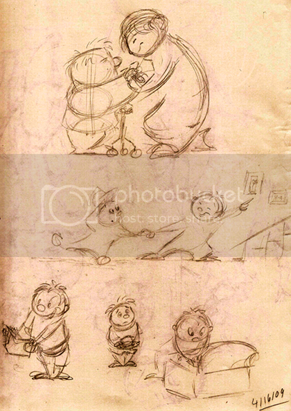 4) This is just a quick (and terribly untidy) series of sketches that I did for fun. All of them feature Carl and his late wife, Ellie. The top sketch is half-heartedly based on an idea I had… which will most likely gestate into a full-fledged chapter (written, of course) one of these days. The middle sketch is based on a moment in the actual film, Up, if I’m not much mistaken. The last few bottom sketches represent my loose interpretation of what continues on after the last scene/middle sketch. Ellie, as a young girl, is searching for something in an old luggage carrier in Carl’s attic. Carl, in the meantime, looks on rather nervously. Ellie finally discovers what she’s looking for in the bottom left-hand sketch.