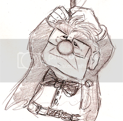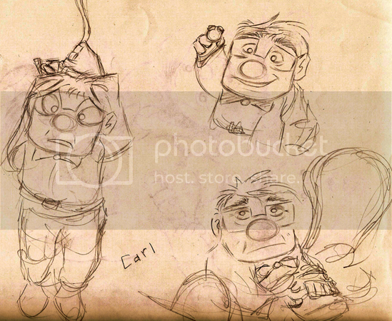 Good sketches of Carl! What’s he doing in the upper-right hand pic? I think he’s pointing, but his fingernail is broken in two or something. I like bottom-right hand pic, very poignant scene from the featurette.