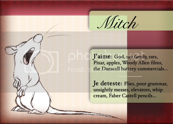 I love how lovely and neat your [b]Deviant Art ID[/b] is, Mitch! I love the sketch of Remy and how you put “J’aime” and “J’deteste” in the profile. Really remarkable.
