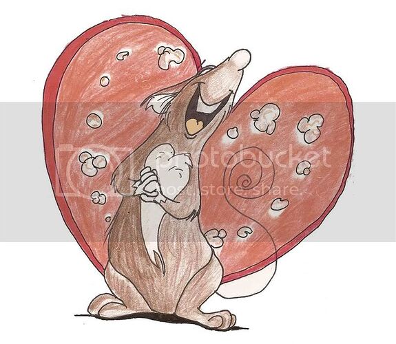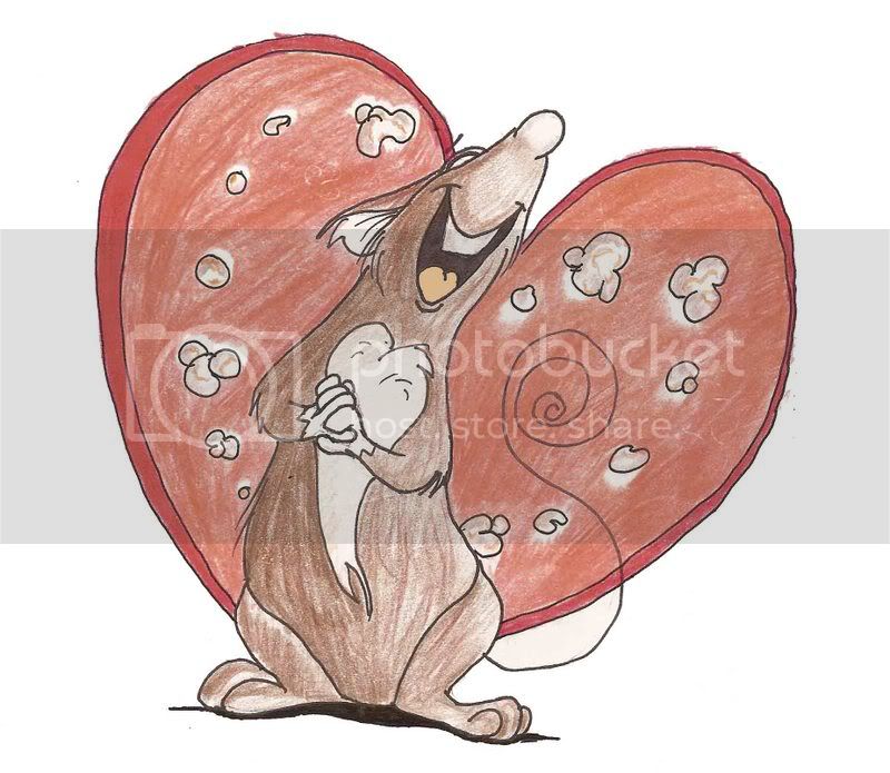 In any case, Gabor le rat loves his popcorn. I probably shouldn’t have made the heart around the popcorn itself so petite, come to think of it, as it makes it look as if Gabor has wings or something of the sort. Ah well. All is fair with hearts and popcorn… or is it?