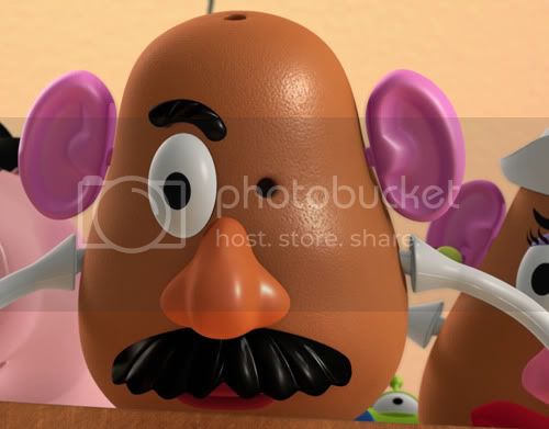 The only way I can explain that is how characters’ faces change when they’re in toy mode. It’s weird, and I wish there was an explanation. One instance is how Mr. Potato Head’s closed-mouth grin turns into a teeth-baring smile by the end. At this point, it’s just starting to look like an inconsistance that no one bothered to take note of. Anyways, is there something below the left side of his eyebrow in that picture? Can’t be a shadow.