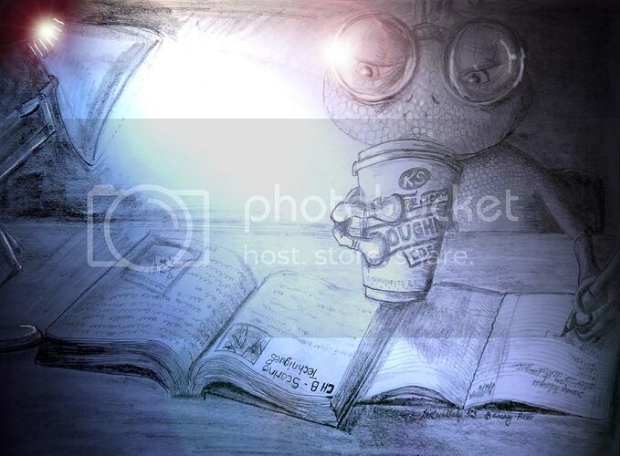 Another pencil drawing of young college-age Randy, studying late at night, getting started on that coffee addiction