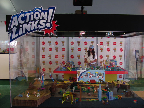 in the toy story fun zone, there is a mattel area showing mattel lines of toys (actionlinks, adult’s collection, 6’’ figures, etc…) the image below shows logos for toy story and mattel in the background: