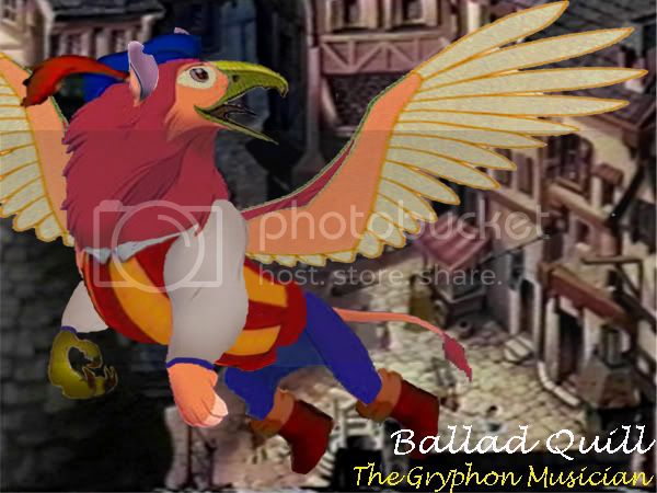 Just for fun, I made a Photoshop picture of my character Ballad Quill, the gryphon musician, constructed out of pieces of various Disney characters like some sort of celluliod Frankenstein .