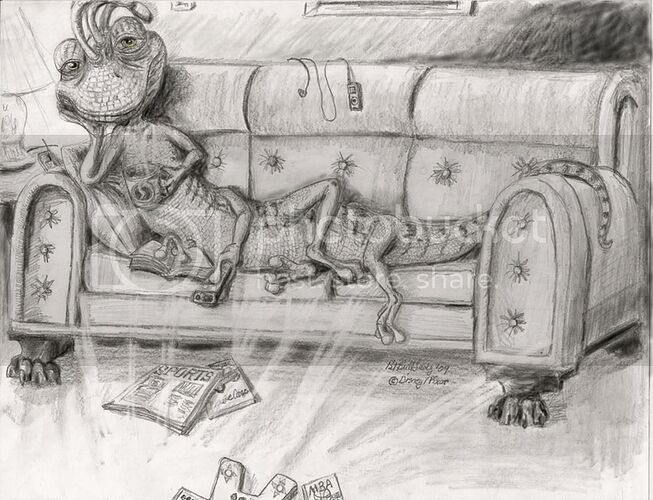 Or, he could just sorta hook 'em behind those jaw muscles, which you can see really well in your sig, proving that it’s a good thing for Sulley that Randall must have outgrown that biting stage in kindergarten! He could sure give Dr. Brady Barr’s “Bite Meter” a workout if he wanted to! I didn’t think too much about how he’d wear the shades, though; Wilt wears both shades and reading glasses, and he doesn’t have visible ears, either, and his head is shaped somewhat like Randall’s, just with those three lobes on each side, but his eyes are way up on stalks. At least Randall’s eyes are still touching his head!