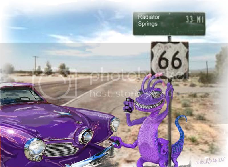 If you’re wondering about the car, the inspiration(aside from my own obsession with Studebaker)comes from the box cover of the old board game, “Monsters, Inc. Game of Life”, on which Randall is seen driving a purple(what else?)bullet-nose Studebaker convertible, albeit one with a couple more tires than the ones I’m used to have! Using my own non-convertible '51 Stude as a model, I changed the top a bit, and made it purple, and re-chromed the bumpers and headlight rims, and gave it a new driver…with a can of Monster Energy drink, of course(too hot for coffee out there in the desert, but if you gotta have a caffeine fix, Monster is the way to go)!