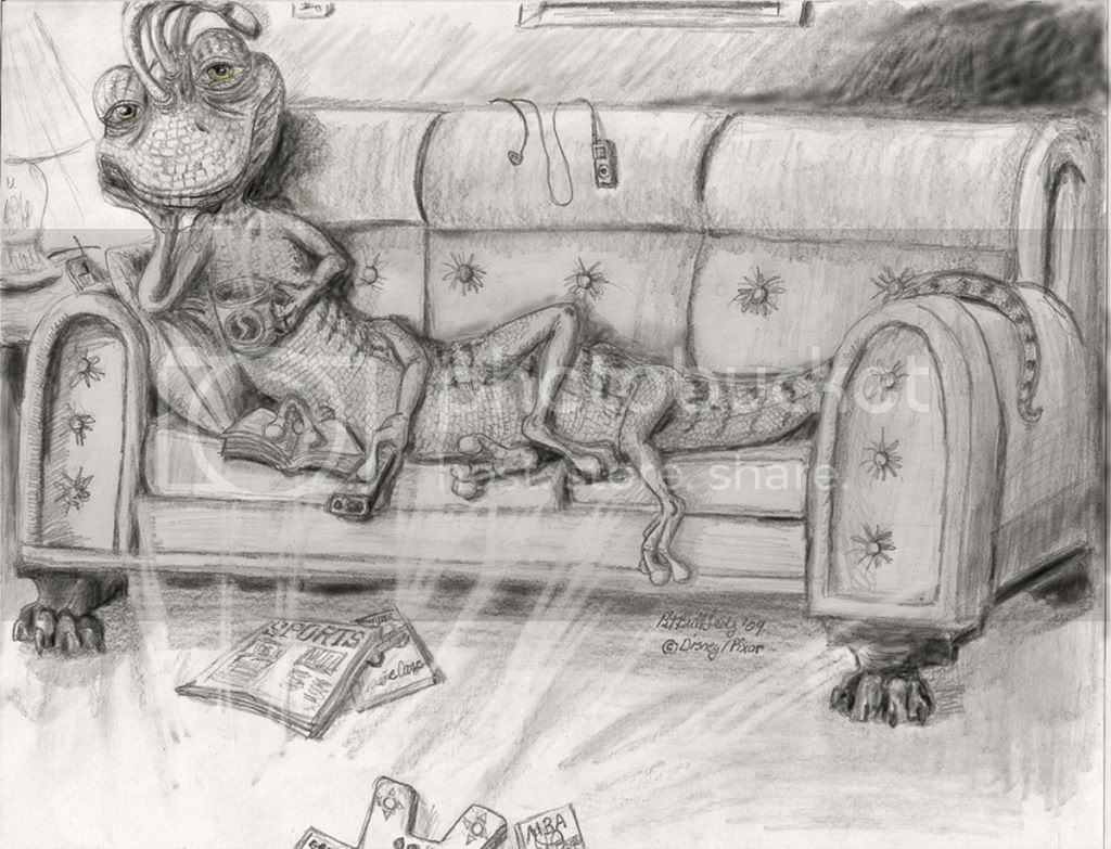 I just sorta walked around with the paper on a clip-board, and it was almost like the pic “drew” itself. I had to change Randall’s position; initially, he was facing the other way, then I realized that since he’s a “lefty”, that would be all wrong for him to be holding the coffee cup in his right hand, so I turned him around and it looked much better.