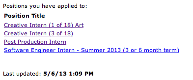 So they’ve sent out rejection letters for Art (I got one), and look at this. The titles of Art and Animation changed to Creative Intern (number of positions out of total positions). So it looks like they are making final decisions, and that at least they know how many there will be. Oh, and I’m not actually applying for all the positions on here; there was a time when I thought the only way to log on was to apply for a new position…oops.