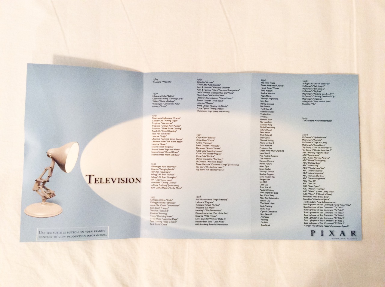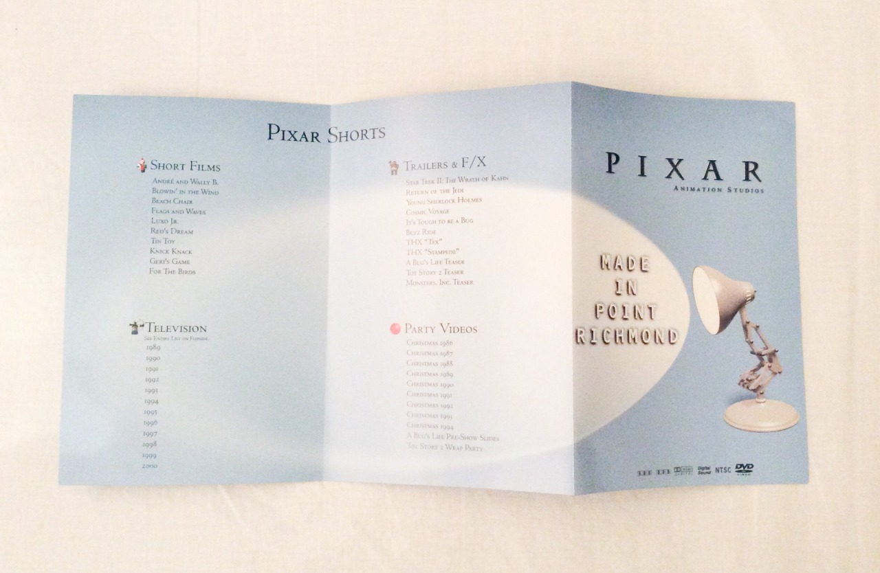 It featured a selection of work PIXAR produced outside of their films; their short films, trailers, F/X work, television work and party videos.