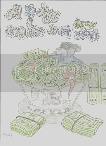 If you can’t read the words, it says: " Only 2 days and they give the rat CHANGE to play with" This is a play on Pixar’s incoming $profits$ ![]()