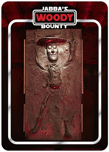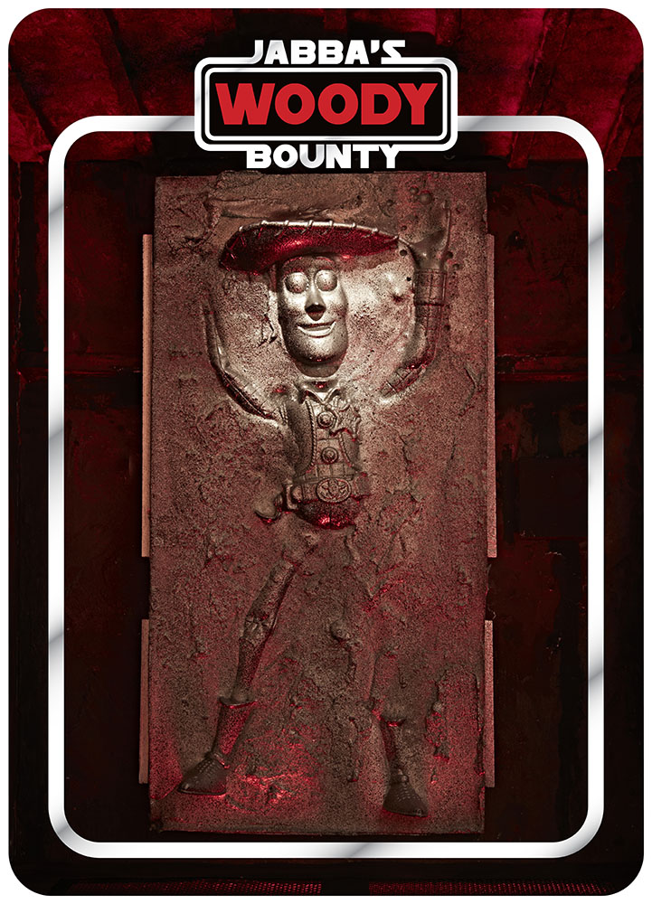 Henry Hargreaves mimicked the carbonite encasing that contained Han Solo in Star Wars Episode V with chocolate and a few actions figures. One of which was Woody. I found it funny that he used Indiana Jones as another “victim”.