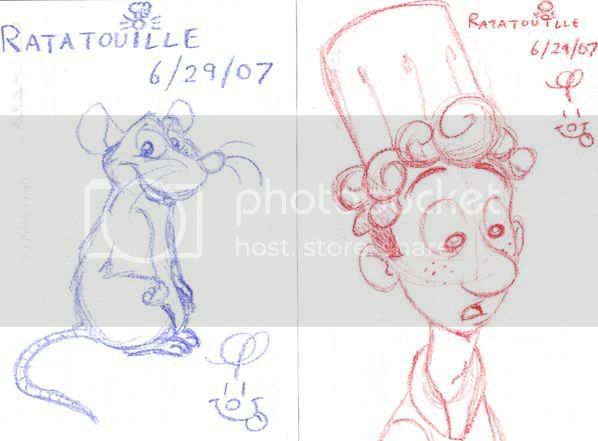 I feel bad, so in honor of Ratatouille’s opening day, I doodled these at work with crayons and no references whatsoever. My Remy stinks, but my Linguini is exceptional.