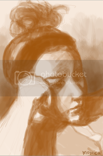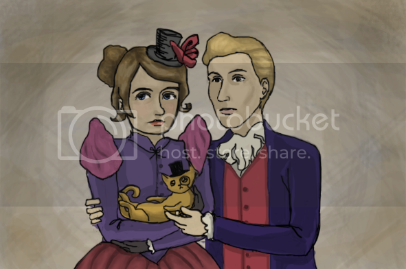 A silly sketch I did on a whim (and continued for a couple hours) of my boyfriend and I cartoonified in Victorian outfits while holding a cat. Trackpad again.